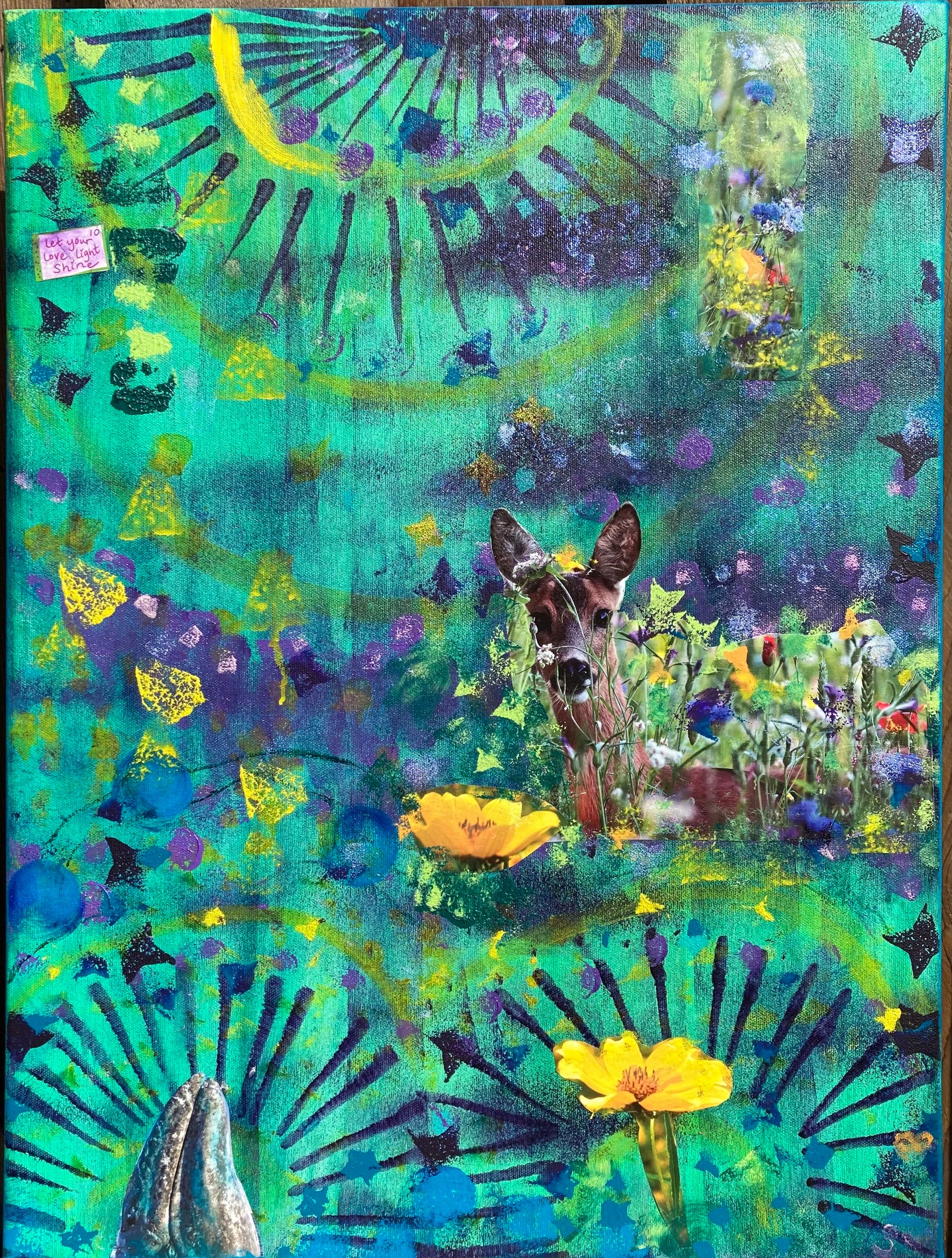 The central figure of the deer in the meadow looks straight at the beholder while flowers bloom all around. The energy of spring, hope, trust and love is palpable.